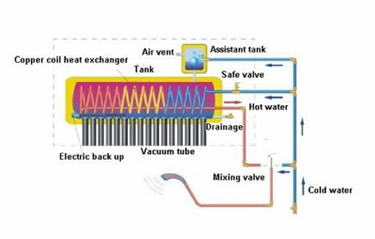 El agua que circula por el serpentín se calienta gracias a la transmisión de calor desde el agua caliente del estanque. Así, el sistema se podría asimilar a un calefont, pero con un serpentín que no es calentado por llama, sino que por agua caliente de un sistema solar.