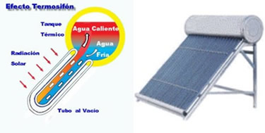 La continua circulación de agua entre cada tubo y el estanque se produce por el efecto de termosifón o circulación natural del agua. Esta dinámica se debe a que las partes calientes de los fluídos tienden a ascender.